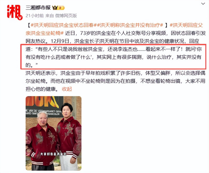 “有些人不只是说我爸爸洪金宝,还说李连杰也看起来不一样了!就问‘你有没有吃什么药或者做了什么’,其实网上有很多揣测,说什么治疗,其实并没有的。”