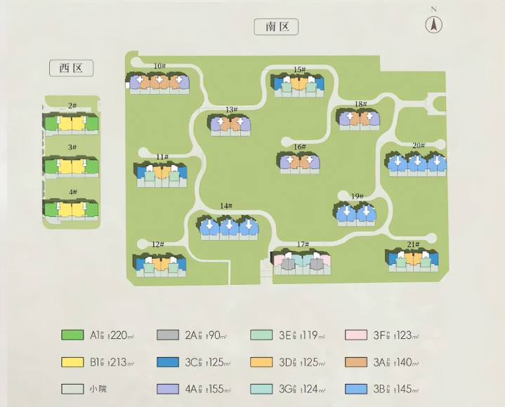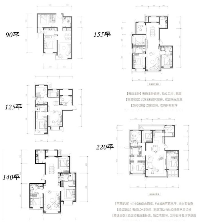 南区为18-25层的高层产品,容积率2.23,近百米楼间距,有90平米、125平米、140平米和155平米四个主要户型,总价范围约600万-1000万元。